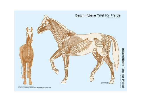 Beschreibung: Auf dieser Tafel finden Sie die Muskelansicht eines Pferdes ohne Bezeichnungen. Sie kann mit trocken abwischbaren Stiften beschriftet werden und ist zum Festhalten der eigenen Notizen zum Wohlergehen Ihres Pferdes gedacht. Die rechte Seite des Pferdes wird auf der einen, die linke auf der anderen Seite der Tafel gezeigt. Auf beiden Seiten der Tafel gibt es eine zusätzliche, kleinere Zeichnung des Pferdes von vorne.