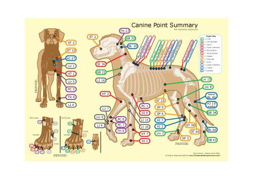 The reverse side indicates each point’s most important use and gives an abbreviated description of its location. Finally, all points forbidden for use on a pregnant dog are identified.
