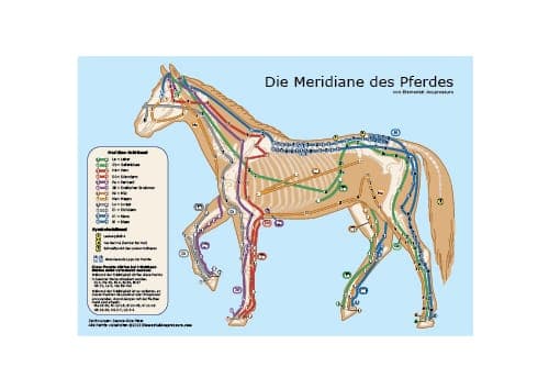 Beschreibung: Diese Chart zeigt die 12 Meridiane (oder Energiepfade), welche in der Ausübung von Akupressur, Akupunktur und energetischem Heilen bei Pferden benutzt werden. Sie zeigt auch zwei der Sondermeridiane (das Lenkergefäss und das Konzeptionsgefäss). Auf dieser Chart sind die Energiepfade über einer Zeichnung des Pferdeskelettes gezeichnet. Auf der Vorderseite ist das Pferd von der Seite abgebildet. Auf der Rückseite sind vier weitere Ansichten gezeichnet, von vorne (cranial), von hinten (caudal), von oben (dorsal) und von unten (ventral).