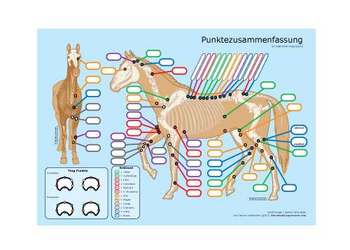 Beschreibung: Diese Tafel hilft beim Lernen der Basisinformation zu den meist benutzten Pferde-Akupressurpunkten. Es ist eine Kopie der Elemental Acupressure Punktezusammenfassung für Pferde, ohne die Bezeichnung der Punkte.