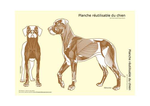 Description: Cette planche montre la structure musculaire du chien et ne contient pas d’inscriptions. Les propriétaires de chien peuvent y consigner leurs observations en utilisant un marqueur effaçable à sec. Chaque côté du chien est présenté sur l’une des faces de la planche. Une illustration plus petite montre le chien de face.