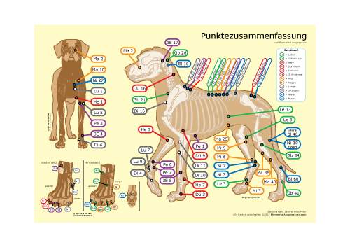 Beschreibung: Diese Tabelle zeigt eine Zusammenfassung der 68 wichtigsten, meist benutzten Hunde-Akupressurpunkten, welche von Elemental Acupressure gelehrt werden. Auf der Vorderseite sind die Punkte auf einer grösseren Seitenansicht und einer kleineren Vorderansicht eingezeichnet. Die Tingpunkte sind aus der Vogelperspektive dargestellt. Jeder Zustimmungspunkt ist nach dem zugehörigen Organ bezeichnet.